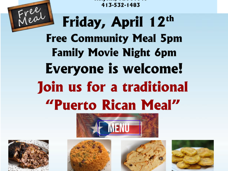 You're invited to join us for our April Community Meal on Friday, April 12th at 5pm. We'll be serving a traditional Puerto Rican meal, featuring roast pork, rice and beans, bread pudding and fried plantains. We'll follow that up with a Family Movie at 6pm. There is no cost. Todos […]