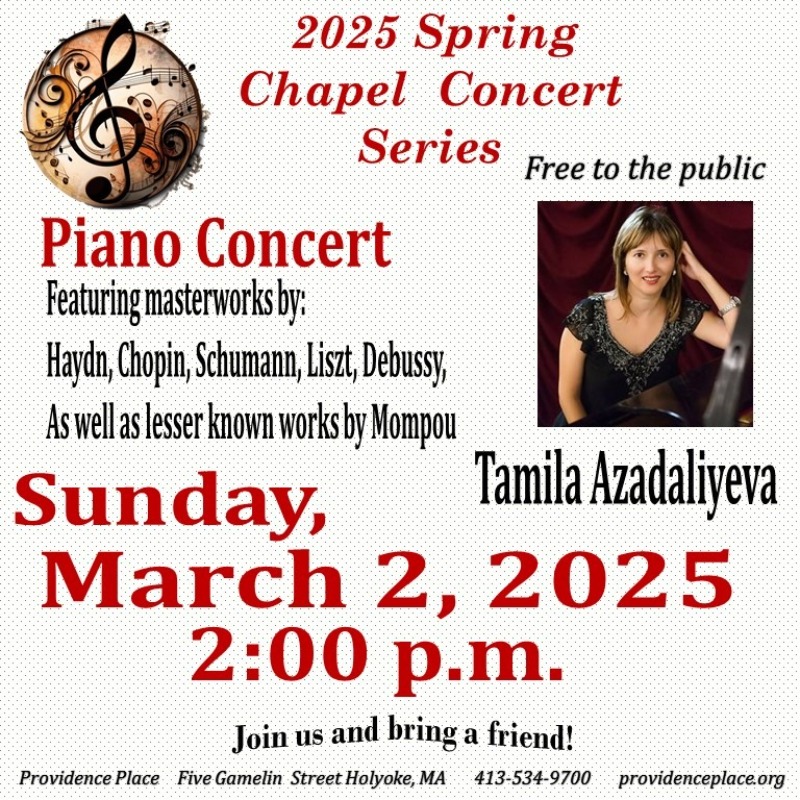 Sunday, March 2nd at 2:00pm in Our Mother of Sorrows Chapel at Providence Place; Tamila Azadaliyeva is performing a piano solo featuring masterworks by Haydn, Chopin, Schumann, Liszt, Debussy, as well as lesser known works by Mompou.