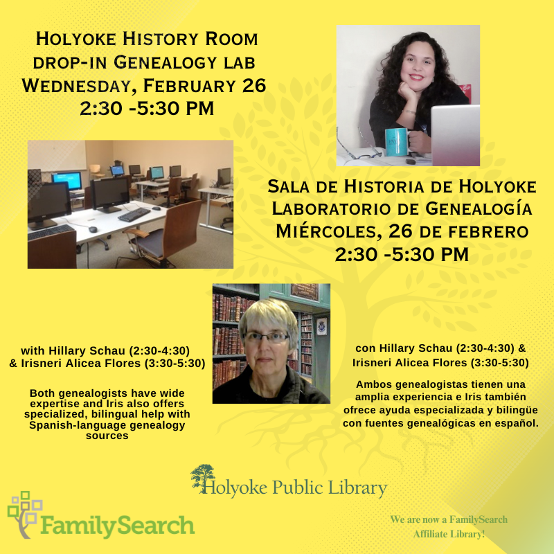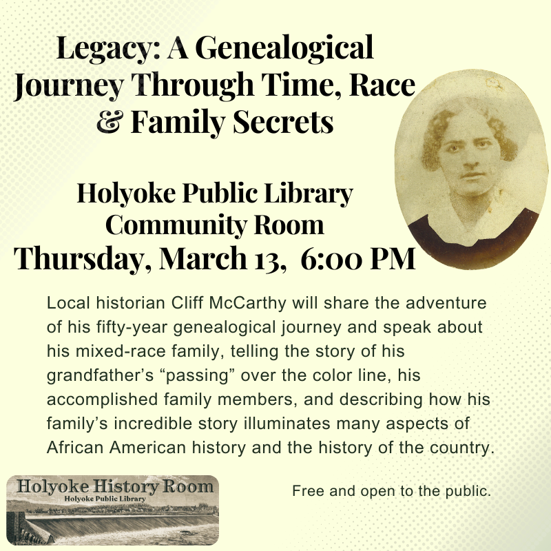 Lisa Dougherty returns to the Holyoke Public Library with a presentation on how to get to basic information on Irish ancestors using online resources. Lisa is an experienced presenter and genealogy consultant. She is the Genealogist-in-Residence at the Irish American Heritage Museum in Albany, New York. Her presentations and workshops […]