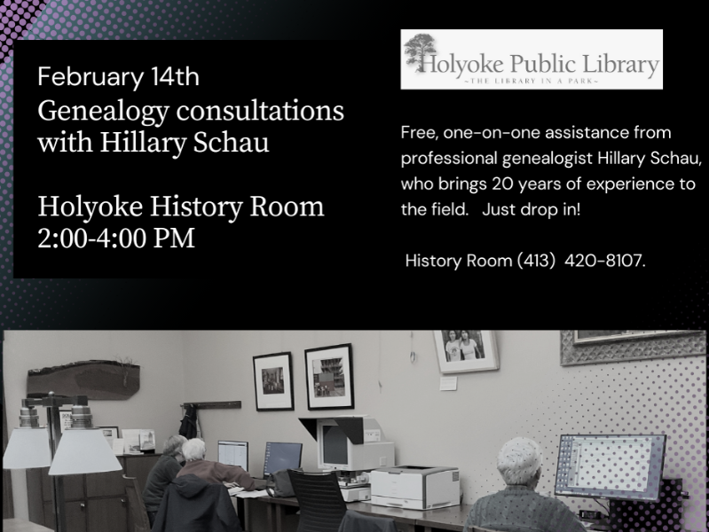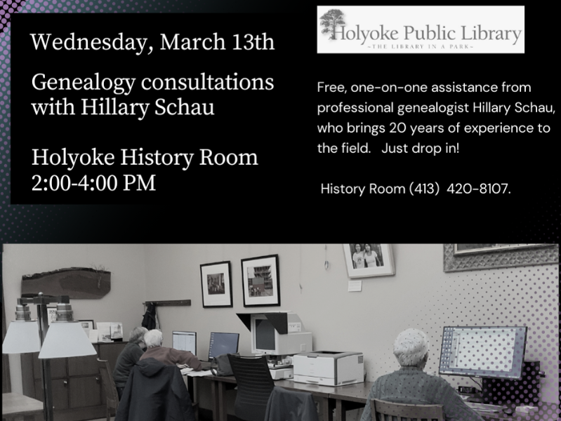 Tuesday, April 2nd, 4:00-6:00. with Iris Alicea Flores Wednesday, April 10th, 2:00-4:00, with Hillary Schau Whether you are a beginner or experienced, our free genealogy drop-ins offer community, expert advice, and assisted access to History Room resources two afternoons per month. Info: (413) 420-8107